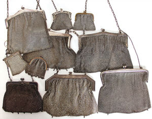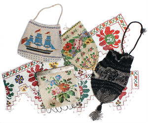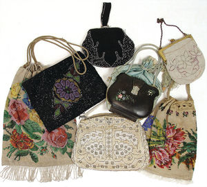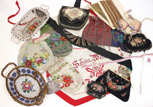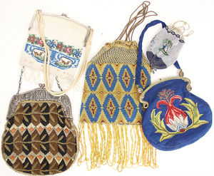 Konv. kl. Biedermeiertaschen, 7 tlg., (auch geeignet als Dekorationsartikel für franz. Bébé), reichh. Perlenschmuck, feine Metall-Taschenbügel