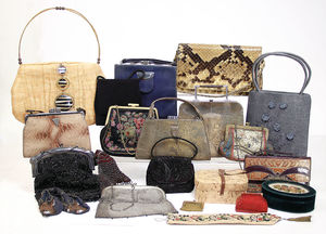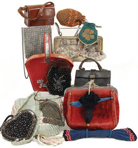 Konv. Damenhandtaschen, untersch. Alter, u.a. 1x Damentasche mit frühem Taschenbügel, Taschenbügel vergoldet mit rosafarbenen Glassteinen, ausgefallen, dazu teilw. Biedermeier-Taschen, u.a. Taschen aus Reptil-Leder-Optik