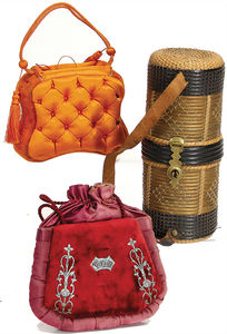 Konv. Kinder- oder Damentaschen, 1x frühe franz. Kindertasche, orangefarben, ca. 1880, Seide sowie Samt, seitl. 2 Quasten, sehr schöner Orig.-Zust., dazu bordeauxfarbene Tasche mit mittigem Samteinsatz, außen Seide, mit Weißblech Ornamenten, 1x früher kl. Tragekorb (auch geeignet für franz. Bébé), ausgefallen