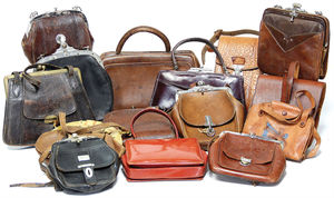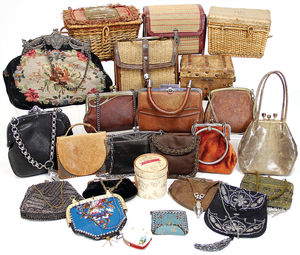 Konv. Damenhandtaschen (auch geeignet als Ausschmückungsteile für Porzellan-Puppen), u. a. Tresor mit Nieten, B: 13 cm, H: 9 cm, holzgeflochtene Körbe, 1 Schulranzen, Taschen aus versch. Zeitepochen, guter Zust.