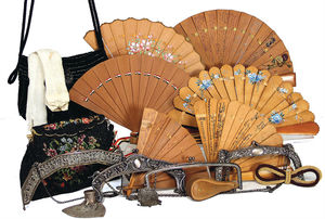 Konv. 8 Holzfächer, 1x Metall-Geldkatze, 1x perlenbestickte Damentasche, sowie einige Taschenbügel, filigran verarbeitet, untersch. Größen, 17-23 cm