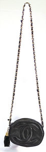 Damenhandtasche, rundes Design, Chanel Logo auf Frontseite, weiches Kalbsleder, langer Kettentrageriemen mit Ledereinsatz, Reißverschluss zum Verschließen, innen aus abwaschbarem Kunststoff, gr. Fülltasche, 1 Seitentasche mit Reißverschluss, Lederquaste mit Chanel Logo, Durchm.: 17 cm