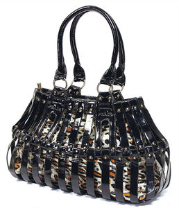 Damenhandtasche, schwarzes Lackleder, Netzform, darunter Lackleder mit Leoparden-Print, Boden gestanzt: Prada Milano, 2 kurze Schultertrageriemen, Reißverschluss zum Verschließen, mit goldfarbenem Zipper mit Prada Milano Aufdruck, Innenfutter aus abwaschbarem Synthetikstoff mit Prada Aufdruck, gr. Fülltasche, 1 Seitentasche mit Reißverschluss, goldfarbener Zipper mit Prada Milano Aufdruck, innen schwarzes Lackleder Prada Emblem, mit goldfarbener Aufschrift Prada Milano, mit 4 goldfarbenen Nieten befestigt, B: 40 cm, H: 27 cm, ausgefallen, minim. Abnutzungsspuren sonst neuw. Zust.