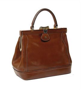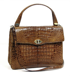 frühe Damenkrokodiltasche, mit IRV-Plakette, Jungkrokodil, braun/grün, kurzer Tragehenkel, sowie Schulterriemen, Messingbeschläge vergoldet, Drehverschluss, innen weiches braunes Kalbsleder, 3 große Fülltaschen, H: mit Trageriemen 32 cm, B: 26 cm, altersbedingte Abnutzungsstellen an Ecken und Kanten, sonst guter Zust.