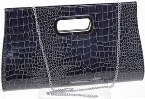 Damentasche, gr. Clutch, Lack-Kroko-Optik, dunkelblau, silberne Messingbeschläge, innen aus abwaschbarem Stoff, 1 Seitenfach, Magnetknöpfe zum Verschließen, B: 38 cm, H: 20 cm, neuw. Zust.