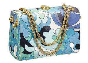 ausgefallene 60er Jahre Hartschalen-Tasche, Made in Italy, bunte Seide, in unterschiedl. Blautönen, vergoldete Messingbeschläge, 2 goldfarbene gedrehte Kettentrageriemen, 4 goldfarbene Stellfüße, B: 18 cm, H: 13 cm, T: 9 cm, innen glattes schwarzes Leder, Seitenschlitz mit türkisfarbener Seide, altersbed. minimale Gebrauchsspuren