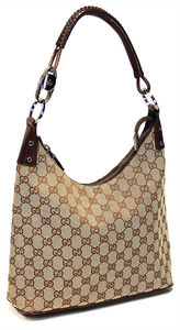 Damentasche, Stoff, Guccissima Muster, Trageriemen aus dunkelbraunem Rindsleder, silberne Beschläge mit Gravur: Gucci made in Italy, Innenfutter aus braunem Stoff, große Fülltasche, Seitentasche mit Reißverschluss und Gucci-Lederemblem, mit Rechnung vom 11. April 2007, Metallreißverschluss, B: 28 cm, H: mit Trageriemen 43 cm, Unterseite Leder, leichte Abnutzungsstellen am Trageriemen, sonst sehr schöner Zust.