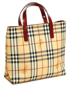 Damentasche, klassisch, Check-Muster, 2 bordeauxrote lacklederne kurze Trageriemen, H: 26 cm, B: 30 cm, mit Magnetknopf, Innenfutter aus beigefarbenem Wildleder, große Fülltasche, 1 Seitentasche mit Reißverschluss, Burberry-London-Emblem mittig, sehr schöner neuw. Zust.