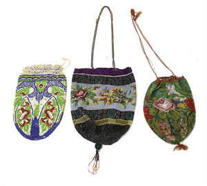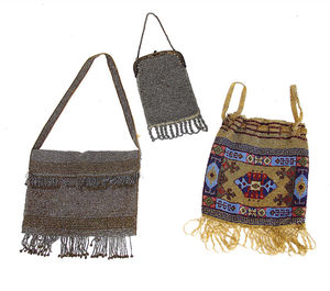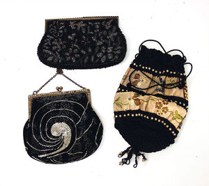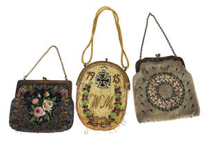 3 Damentaschen, 1x ca. 1915, 2 reichh. Perlen bestickte Damentaschen, 1x mit silbernem Taschenbügel, filigran verarbeitet, ausgefallen