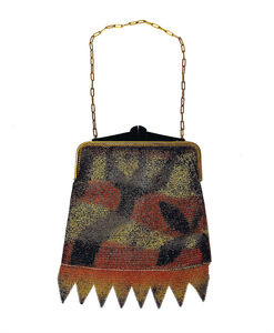 Damentasche, mit reichh. Perlen bestickt, gold- und blaufarben, griechische Musterung, dazu 2 Metallperlen-Kettentaschen