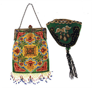 2 Damentaschen, 1x Damentasche, Perlen bestickt, mit filigran verarbeitetem Taschenbügel, mit reichh. Steinbesatz, L: 29 cm, B: 16 cm, 1 frühe Beuteltasche, teilw. Perlenstickerei, grün, L: 32 cm, guter Zust.