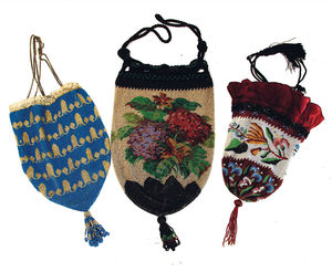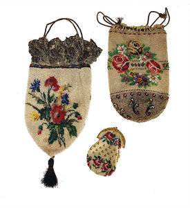 Konv. Handtaschen, Biedermeier, reichh. Perlen bestickt, 1x Biedermeiertasche mit Silberrahmen, H: 18 cm, B: 17 cm, 1x Biedermeier-Borte, sehr schöner Orig-Zust.