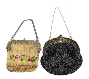 2 Damentaschen, 1 Damentasche ca. 30er Jahre, Metall sowie Metallperlenverzierung, Taschenbügel aus Bakelit, H: 16 cm, B: 17 cm, 1 bestickte Damentasche, mit prächtigem Perlenschmuck, 23 cm, reichh. verzierter Kettenbügel, ausgefallen