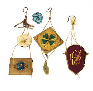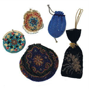 Konv. Damenhandtaschen, Biedermeier, 5 tlg., 1x ausgefallene Damenstofftasche, mit Seerosenmuster, filigran verarbeiteter Taschenbügel mit seitl. geschwenkten Drachen, dazu Taschen mit reichh. Perlen bestickt, schönes Konv., guter Zust., bitte besichtigen
