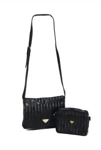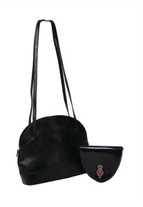 2 Damentaschen, Suisse, 1 schwarze Umhängetasche, mittig silberne dreieckige MM-Plakette Nr: 45726, Klappverschluss mit Magnetknopf, 2 große Fülltaschen, B: 32 cm, H: ohne Schulterriemen 26 cm, dazu 1 kl. Damenumhängetasche, frühes Modell, mit goldfarbener dreieckiger MM-Plakette, mit größenverstellbarem Schulterriemen, 1 Außentasche, Innenfutter aus cognacfarbenem Leder, große Fülltasche, 1 Seitentasche mit Metallreißverschluss, B: 21 cm, H: ohne Schulterriemen 16 cm, Abnutzungsstellen an der Plakette