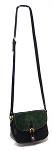Trachtentasche, Leder, grün/schwarz, Klappverschluss mit Magnetknopf, Innenfutter aus abwaschbarem bordeauxrotem Stoff, große Fülltasche, 1 Seitentasche mit Reißverschluss, 1 größenverstellbarer Schulterriemen, B: 23 cm, H: ohne Schulterriemen 18 cm, guter Zust.