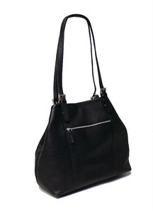 Shopper, Leder, schwarz, ausgefallen, dickes Rindsleder, mit 2 größenverstellbaren Schulterriemen, Magnetknopf mittig, B: 40 cm, H: 60 cm, große Fülltasche, Seitenfächer sowie Seitentasche mit Reißverschluss, außen 1 Seitentasche mit Reißverschluss, guter Zust.