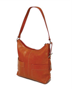 Umhängetasche, weiches Leder, orange mit beigefarbener Naht, größenverstellbarer Schulterriemen, B: 36 cm, H: mit Schulterriemen 58 cm, Zipper mit Lederband, Innenfutter aus abwaschbarem Stoff, Fossil-Emblem, große Fülltasche, 1x Handytasche seitlich, 1 Seitentasche mit Reißverschluss, sowie 1 Seitentasche Leder, bis auf minim. Stellen in sehr gutem Zust.
