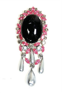 Brosche, silber, mit dunkelblauem ovalem Glasstein mittig, seitlich fein geschliffen, mit reichh. Strasssteinbesatz, sowie Perlentropfen, ausgefallen