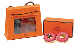 Damenohrclips, goldfarben, mit rundem pinkfarbenem Leder, Rückseite gemarkt: Hermès Paris, Durchm.: 3 cm, im Orig.-Kart., dazu kl. Hermès Tüte mit 2 kl. Parfumflacons, 1x Calèche, Soie de Parfum 1x Eau d‘Orange Verte, 7,5 ml, neuw. Zust.