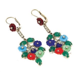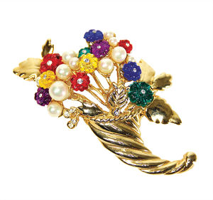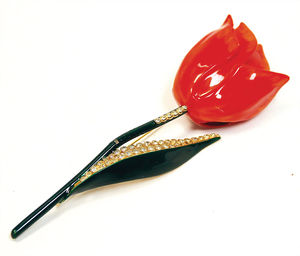 Brosche, Tulpe mit Stiel, Tulpenkopf aus bemaltem Porzellan, Stiel mit goldfarbenem Strasssteinbesatz, innen gemarkt: VALENTINO, L: 15 cm, leichte Abnutzungsspuren, sonst guter Zust.