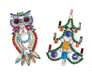 2 Broschen, Vintage, mit reichh. Strasssteinbesatz, 1x Tannenbaum, 7 cm, 1x Eule, altersbed. Gebrauchsspuren auf der Rückseite, sonst guter Zust.
