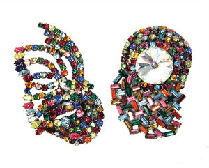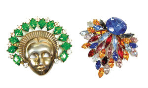 2 Broschen, 1x Joseff, Vintage-Damenmaske, mit reichh. Strasssteinbesatz, filigran verarbeitet, 6 cm, dazu 1x dreieckige Brosche, Strasssteinbesatz, versch. Farben, mit 1 gr. blauen Strassstein, H: 6 cm, L: 6 cm, guter Zust.