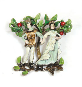 Dornröschen-Brosche, König und Königin vor einem Apfelbaum, ausgefallen, L: 3,5 cm, H: 3,5 cm, leichte Abnutzungsspuren