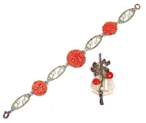 2 Teile, 1x Kettenanhänger mit Koralle auf Glas, 5,5 cm, 1x Kinderarmband mit Korallenblüten, versilbert, 17,5 cm