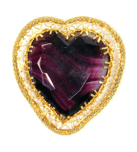 Damenbrosche mit mittigem lila Glasherz, Modeschmuck, fein geschliffen, in goldfarbener Fassung, B: 4,5 cm, H: 5 cm, altersbed. minim. Gebrauchsspuren