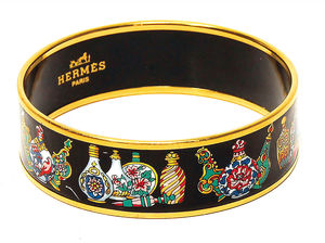 Damenarmreif, Stahl, vergoldet, Vorder- und Rückseite emailliert, mit Druckdekor, verzierte Flaschen auf schwarzem Hintergrund, Innenseite schwarz mit goldfarbenem HERMÈS PARIS und Made in Austria Stempel, Durchm.: 6,5 cm, B: 2 cm, guter Zust., im Orig.-Kart.