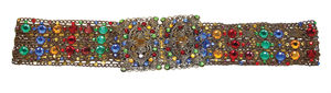 Gürtel, mit bunten Strasssteinen verziert, Strasssteine unvollständig, 2 Metall-Vorderschnallen zum Verschließen, B: 6 cm, L: 80 cm