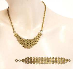 Modeschmuck aus Idar Oberstein, 30er Jahre, Messing, 2 Teile, 1x Halskette, mit dreireihigem Mauerwerk-Design, mit leichten Abnutzungsstellen, dazu 1x Armband, 20 cm, mit teilw. verarbeitetem Mauerwerk-Design, schöner Zust.