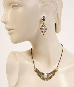 Modeschmuck aus Idar Oberstein, 30er Jahre, Messing, 2 Teile, 1x Halskette, in sich verarbeitetes Ringdesign, leichte Abnutzungsstellen, dazu 1 Paar passende Ohrclips, altersbed. minim. Gebrauchsspuren
