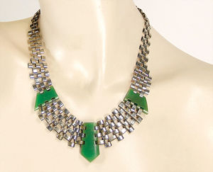 Modeschmuck aus Idar Oberstein, 30er Jahre, Halskette, Messing versilbert, grüner Galalith, getragener Zust.