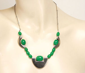 Halskette, Artdeco, mit grünen Halbedelsteinen, versilberte Messingelemente, guter Zust.