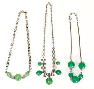 3 Halsketten, 1x mit grünen Halbedelsteinen, 2x Galalith, Messing versilbert, guter Zust.