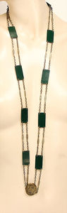 Halskette, lang, mit grünen Galalithplatten, runder Messingverschluss, genutzter Zust.