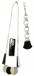 Konv. 3 Teile, 1x Halskette, mit schwarzen Galalith- und versilberten Metallplatten, 1x Brosche mit schwarzer Kunststoffplatte, 1x Uhrenanhänger, guter Zust.