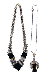 2 Halsketten, 1x V-förmige Gliederkette mit schwarzen Kunststoffsteinen, 1x Artdeco Anhänger mit schwarzem eingesetzten geschliffenem Kunststoffstein, mit Kette, Messing versilbert, sehr schöner Zust.