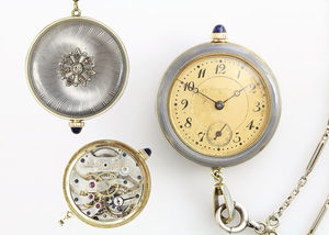 Damentaschenuhr mit Kette, JUGENDSTIL um 1910, LONGINES, GG 585/000, arab. Zahlen, gebl. Zeiger, Schmuckkrone mit blauem Stein, Kunststoffglas, Gehäuseboden Gravur: Wittnauer & Co SWISS 130607, feines graues transluzides u. weißes Emaille, (umlaufender Rand), auf dem Gehäuseboden Applikation mit 1 Altschliff Diamant und 7 sehr hoch geschliffene Diamantrosen, Uhrwerk grav.: 3 ADJ 15 JUWELS LONGINES W.Co.SWISS 3066480, D = 26,5 mm, Uhr läuft; Uhren-Kette WG 585/000, L = 66 cm