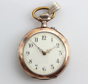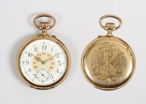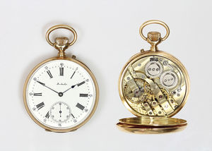 Herren-Taschenuhr um 1905, GG 585/000, E.Z. Blatt sehr guter Zustand, Zeiger Louis 15, rot u. schwarz abgesetzte arab. Zahlen ( 24 Std. Abziehbild), kl. Sekunde auf 6 Uhr, Vollankerwerk mit 15 Rubinen, (3 Chatons), Brequetspirale, Z.B.Metall, Kronenaufzug, Rückseite graviert: "EK" D = 49,5mm, Uhr läuft