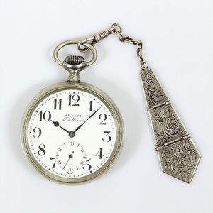 Herren-Taschenuhr ZENITH GRAND PRIX 1900, sig: F.Mares, Silber, E.Z. Blatt guter Zustand, arab. Zahlen, kl. Sekunde auf 6 Uhr, gebl. Zeiger,Vollankerwerk, Exenter Feinregulierung, Brequetspirale, Z.B.Metall, Kronenaufzug, Rückseite graviert: D J und eine Krone, wohl aus adeligem Besitz, D = 52,3mm, Uhr läuft; Chatelaineanhänger mit Karabiener in Silber gearbeitet