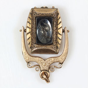Anhänger/Medaillon für Uhrenkette 2.Hälfte 19.Jhd., Double, 1 Seite Onyxplatte, 1 Seite gravierter Hämatit (Krieger mit Helm), H = 41 mm