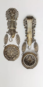 Chatelaine um 1880/90 für eine Taschenuhr, Deutsch Hanau ?, Silber, mittels Clip zum Einhängen in die Revertasche, Karabiner für Taschenuhr, H = 13,2 cm
