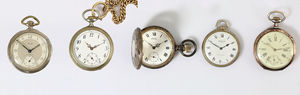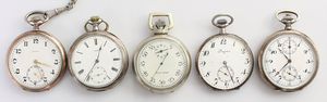 Lot: Herrentaschen-Uhren: 1 x LONGINE, Silber 900/000, D = 49,5 mm; 1 x Stoppuhr, Silber 800/000, D = 52,5 mm; 1 x ELGIN TIMER, Metall, D = 50 mm; 1 x ZENITH, Silber 800/000, D = 52 mm (2ter Boden fehlt; 1 x OMEGA, Silber 800/000, D = 51,5, alle Uhren ungeprüft !