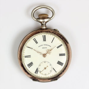 Zylinder-Herrentaschenuhr, FRITZ REMETTER, Mainz um 1900, Silber 800/000, E.Z.Blatt mit röm. Zahlen, fein gearbeitete Zeiger, Minutenpunkte goldfarben abgesetzt, kl. Sek. auf 6 Uhr, Gehäuse kupferfarben abgesetzt, Glas wurde ersetzt, D = 47 mm, Uhr läuft