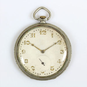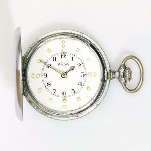 Blindentaschenuhr, ARSA, Metallgehäuse, Stiftanker, E.Z.Blatt mit arab. Zahlen und Punktindex zum Abtasten, D = 51 mm, Uhr läuft, ist aber gut benutzt worden, Sprungdeckel funktioniert nicht einwandfrei !