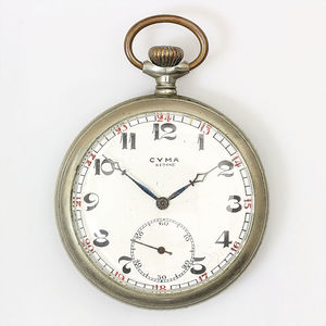 Herrentaschenuhr, CYMA, Metallgehäuse, arab. Zahlen, kl. Sek., gebl. Zeiger, Vollanker, Brequetspirale, ( kein Originalglas), D = 50,5 mm, Uhr läuft