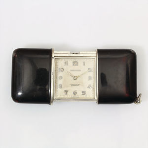 Reise-Taschenuhr ART-DECO 1920/30er Jahre, MOVADO-ERMETO, Silber 935/000, schwarzer Emaillelack, arab. Zahlen, die Uhr wird durch zusammenschieben und auseinanderziehen aufgezogen, wahlweise auch über die Krone, durch eine Öse kann eine Kette gezogen werden, 47,0 x 33,5 mm im geschlossenem Zustand, Uhr läuf